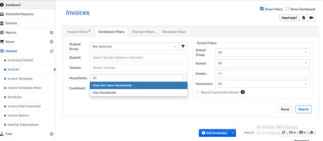 - In Invoices, filter by "Does not have household" to see who's missing an account.