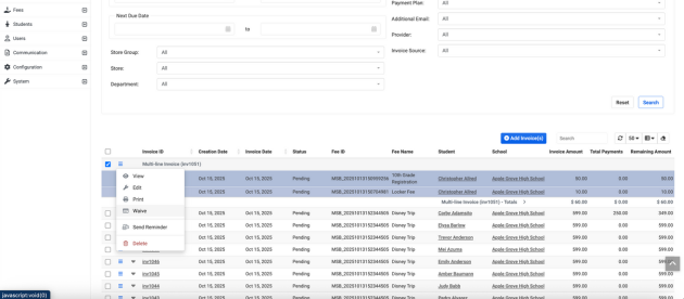 - Waive vs. Delete: A "Waive" keeps a record and prevents that same fee from being reassessed later. A "Delete" removes it completely so you can reissue it if needed. (Admin Support can enable "Delete" permissions where necessary.)