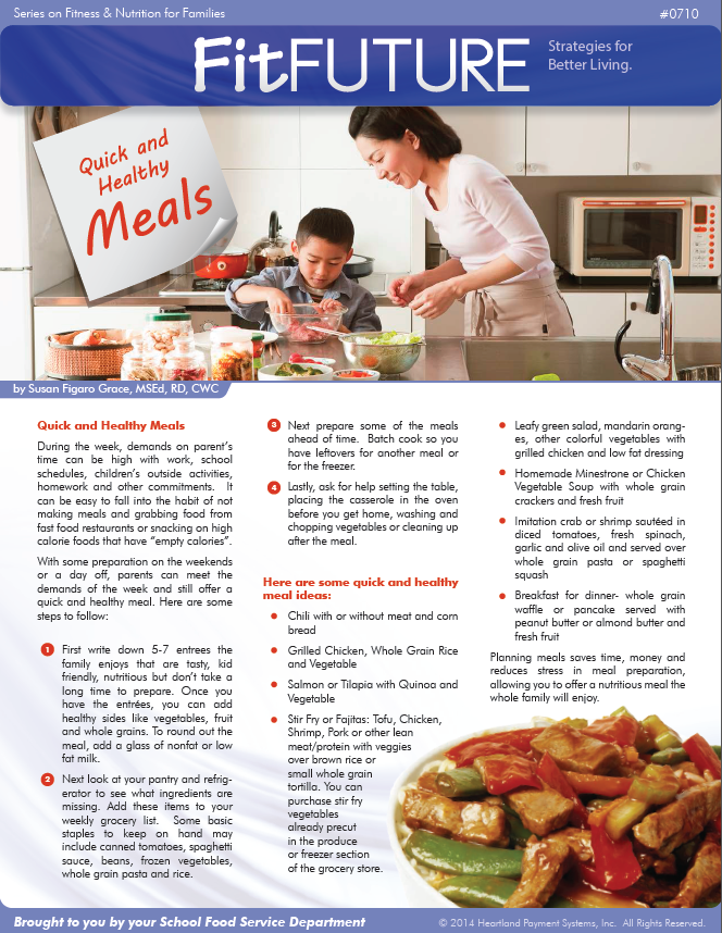 Each work week, the demanding schedule of being a parent can make it easy to resort to on-the-go, high calorie foods in place of more nutritious family meals. With that in mind, this month's FitFuture focuses on tips to create quick and healthy meals the whole family will enjoy.